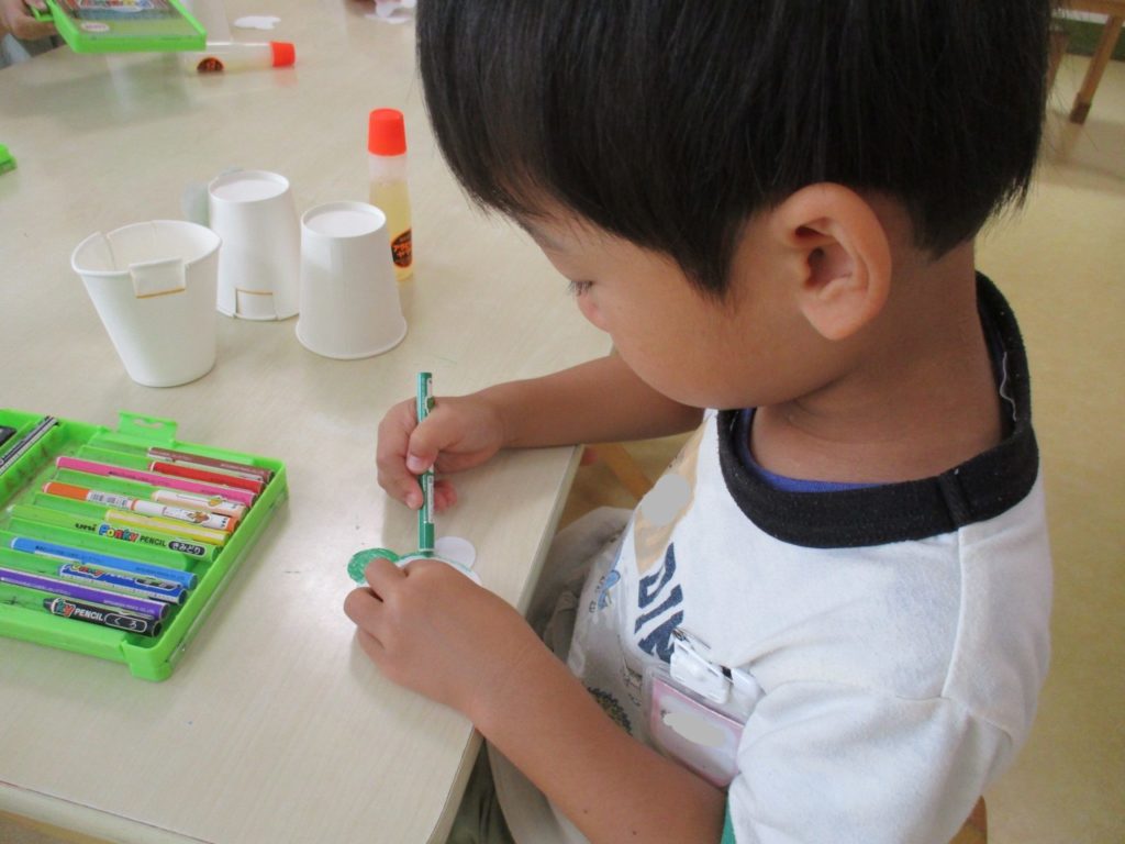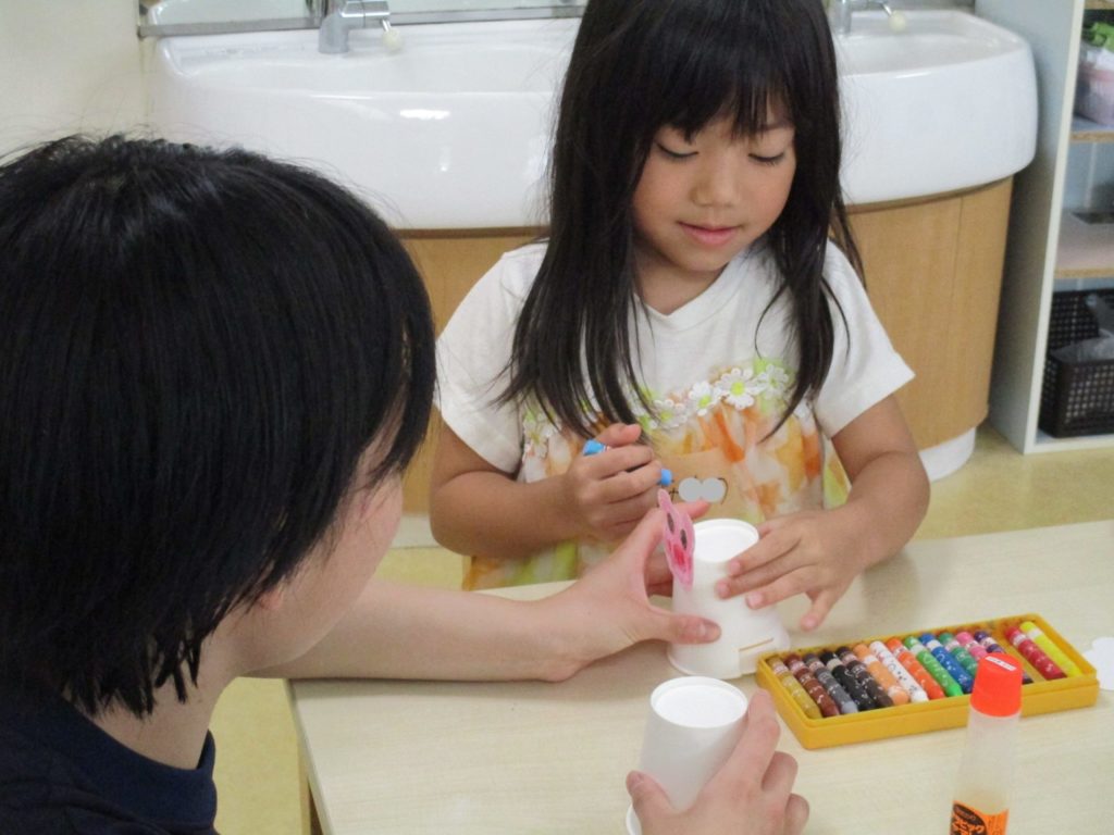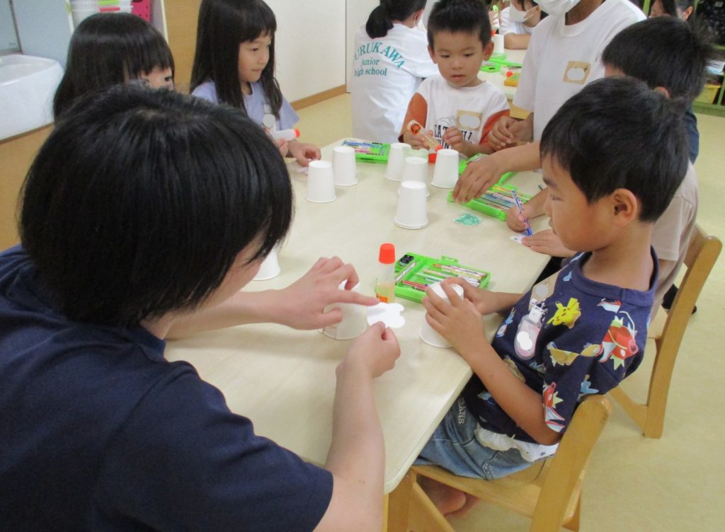 緊張気味のにじ組さん…お姉さんたちとぴょんぴょんカエルの制作をしたよ🐸