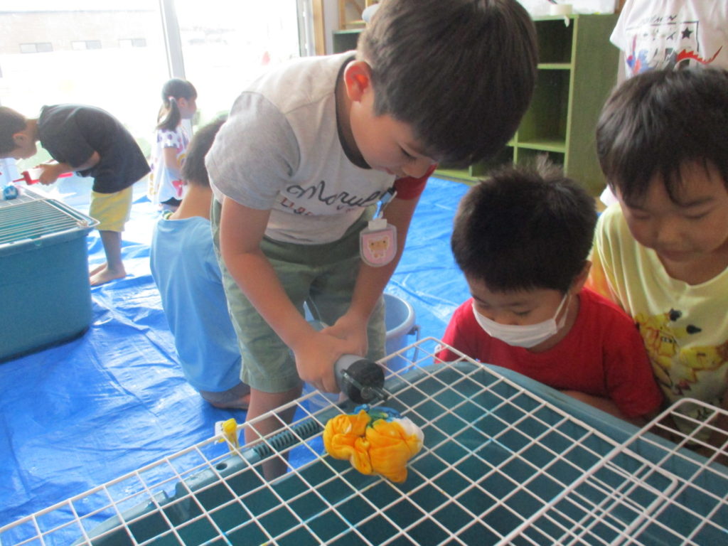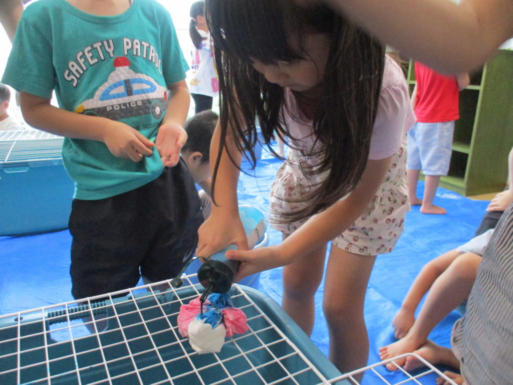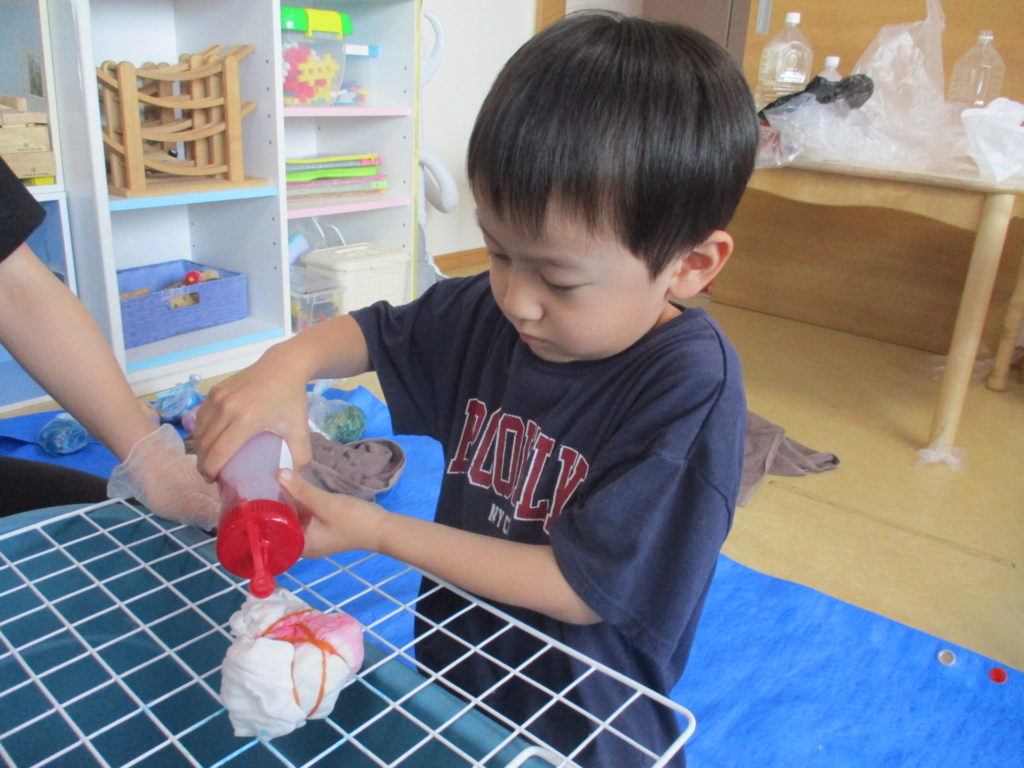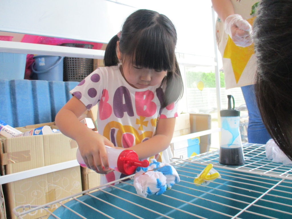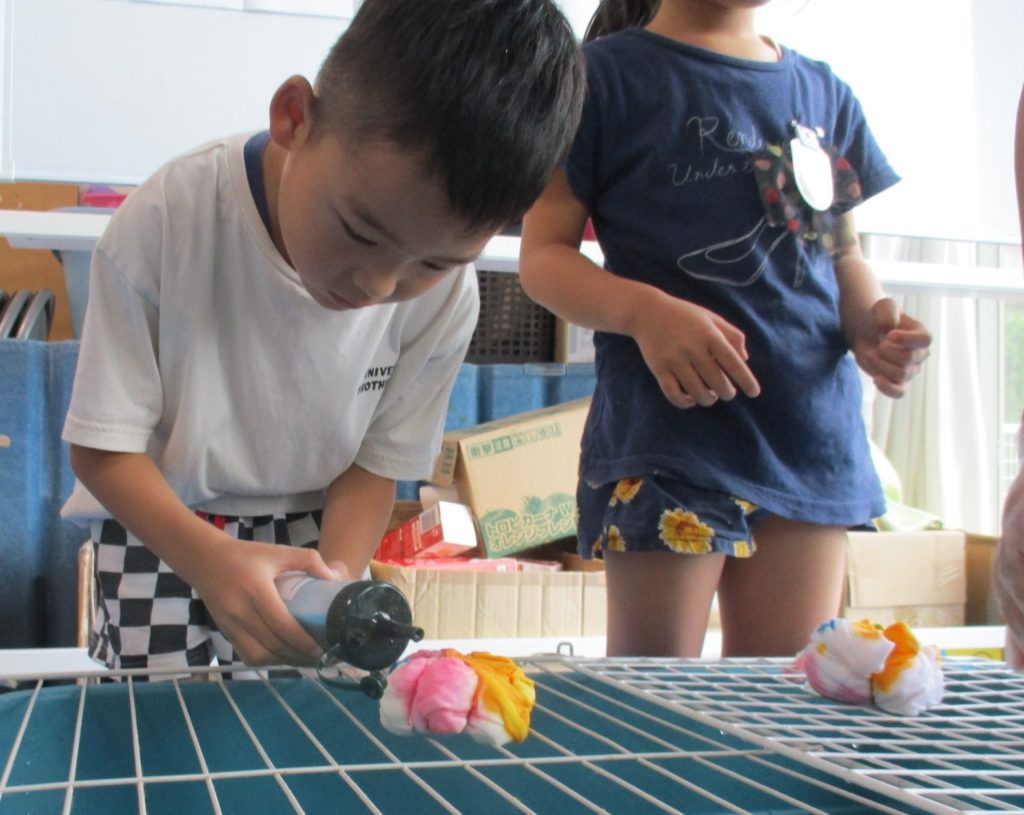 お泊り会が延期・・・。でも、お泊り会でやる予定だったTシャツ染め☆に挑戦しました!それぞれ好きな色を選んで・・・いざ染め方に!どんな色になるかな~