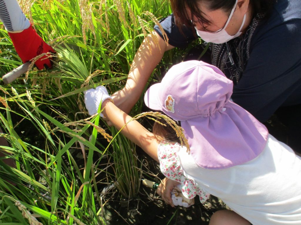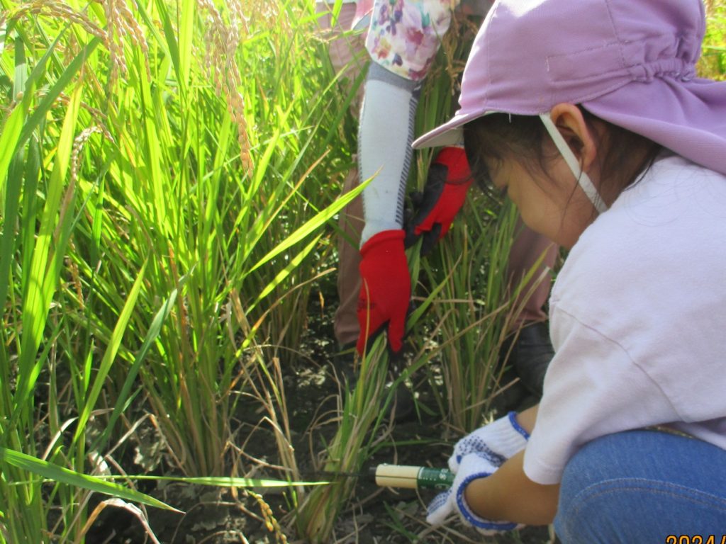 しっかり稲を持って、釜にも気を付けてー! 「こうかな~?」「切れてきたー!」真剣に取り組んでいたにじ組さんです◎