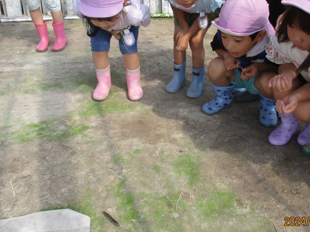 何かの幼虫?も見つけたよ!みんなで観察~👀‼ 「ちょうちょかな?」「いやいや、蛾かもしれない」なかなか大きな黒い幼虫でした💦