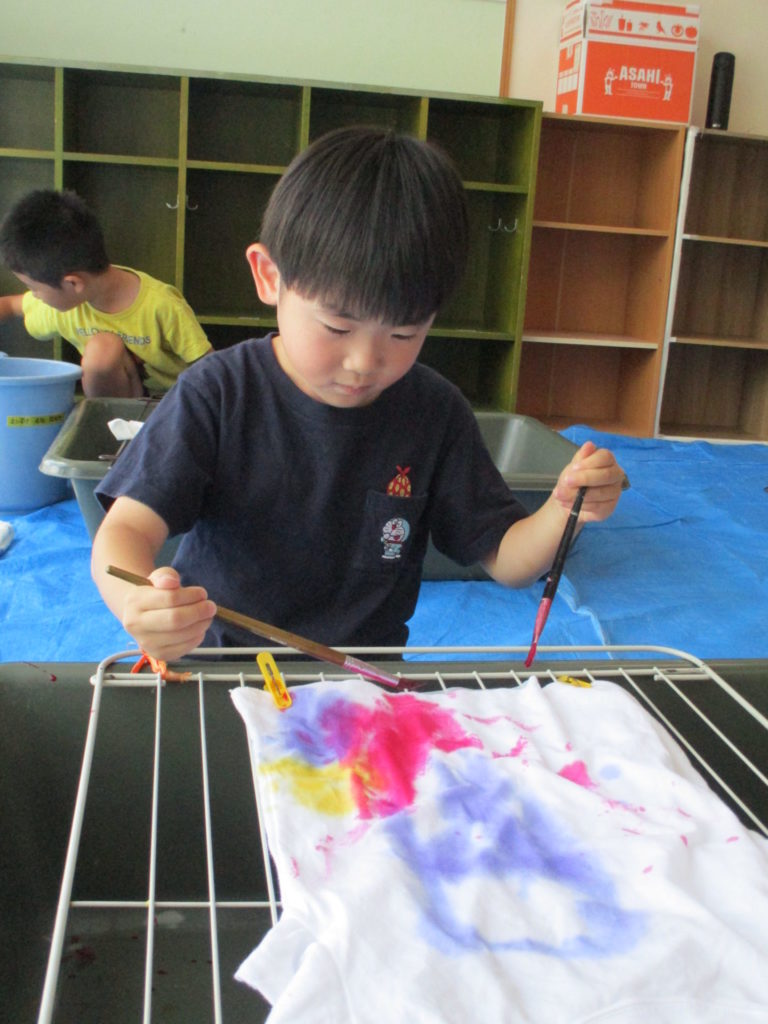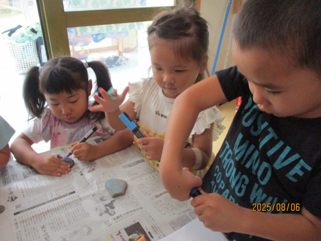 8月のほし組さんは石ころアートをしました! 海で拾ってきた石は大きくて丸く平べったい形で園庭にある石とは違うことに興味津々のほし組さん✨ 気に入った石を選び、お絵描きスタート!!
